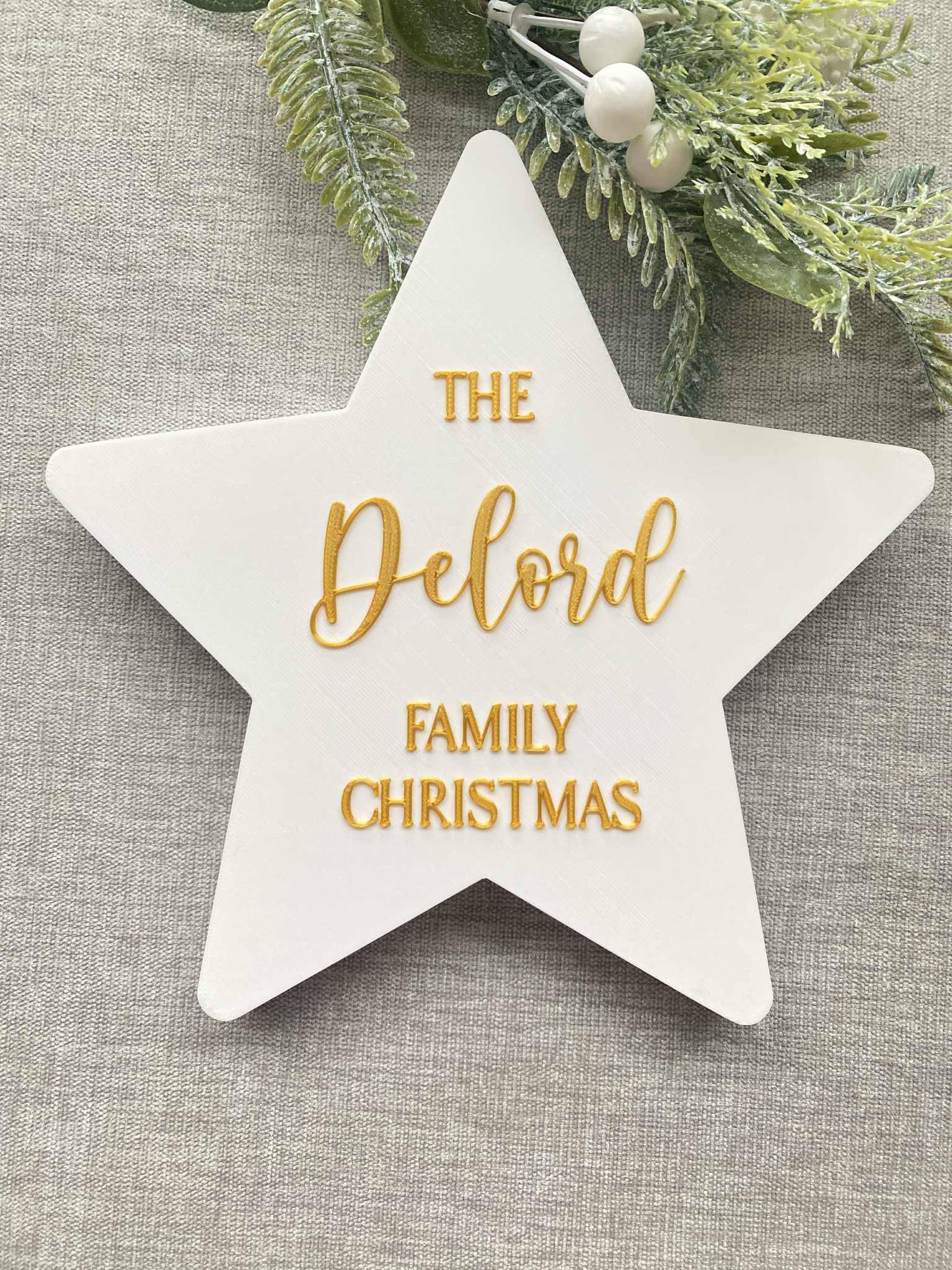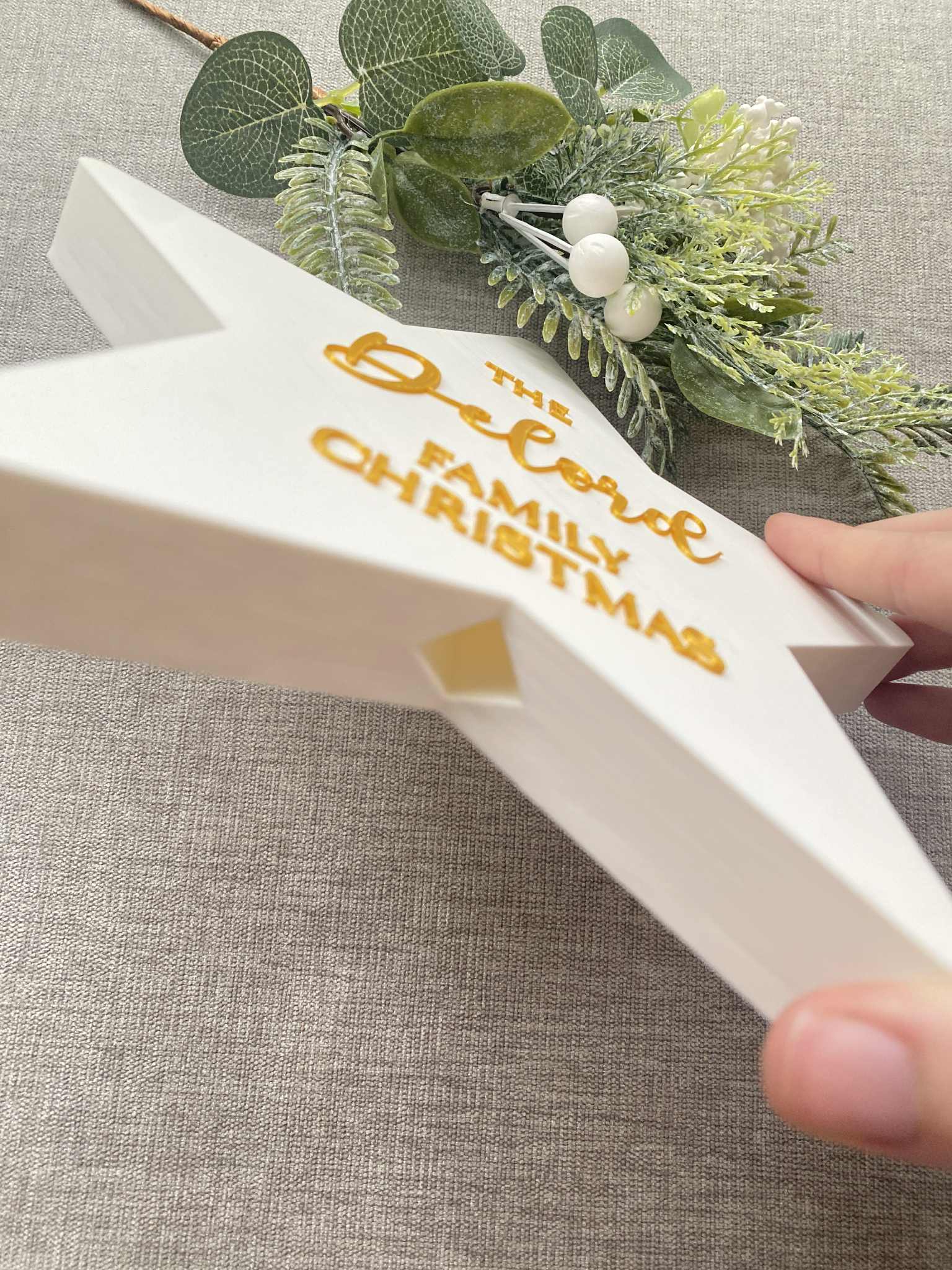 Our ‘Personalised Christmas Tree Star’ is the perfect personalised addition to your Christmas Tree this year! A great way for mothers, fathers and family’s to add a personalised touch to their Christmas Tree’s . Our Personalise Christmas Tree can be placed on a tree or be freestanding and used as personalised Christmas décor! Available in multiple sizes.