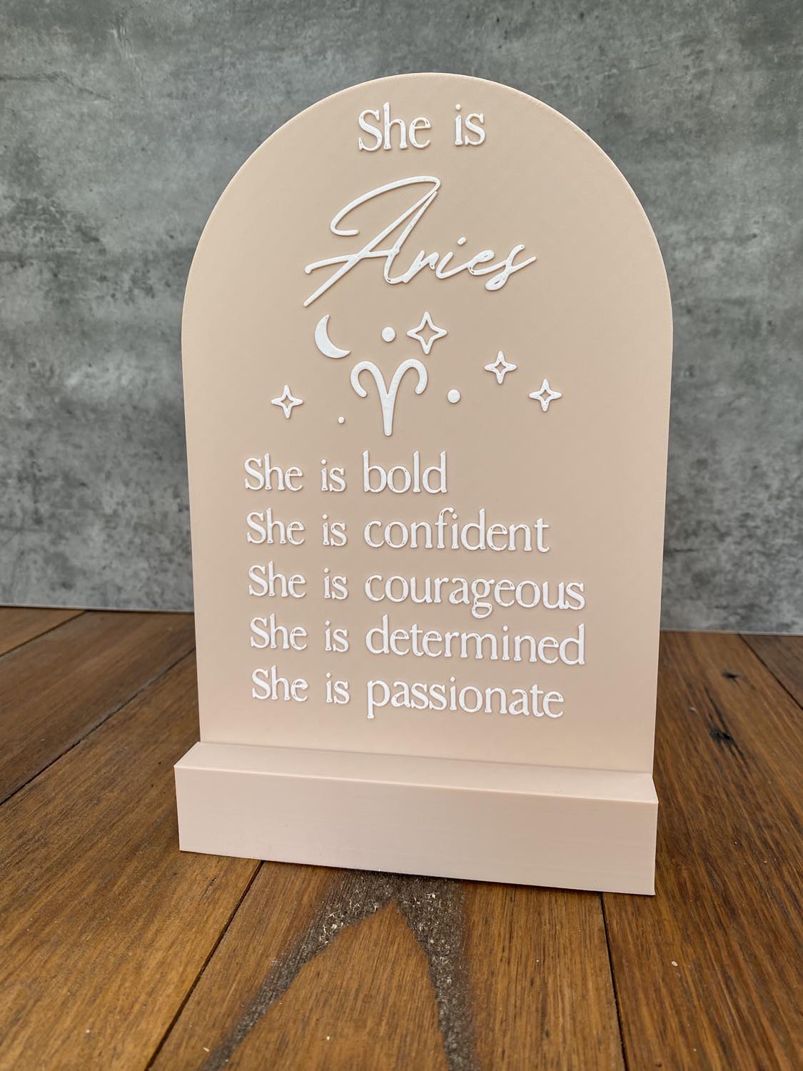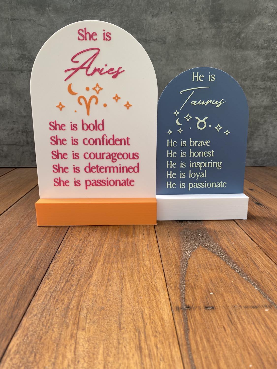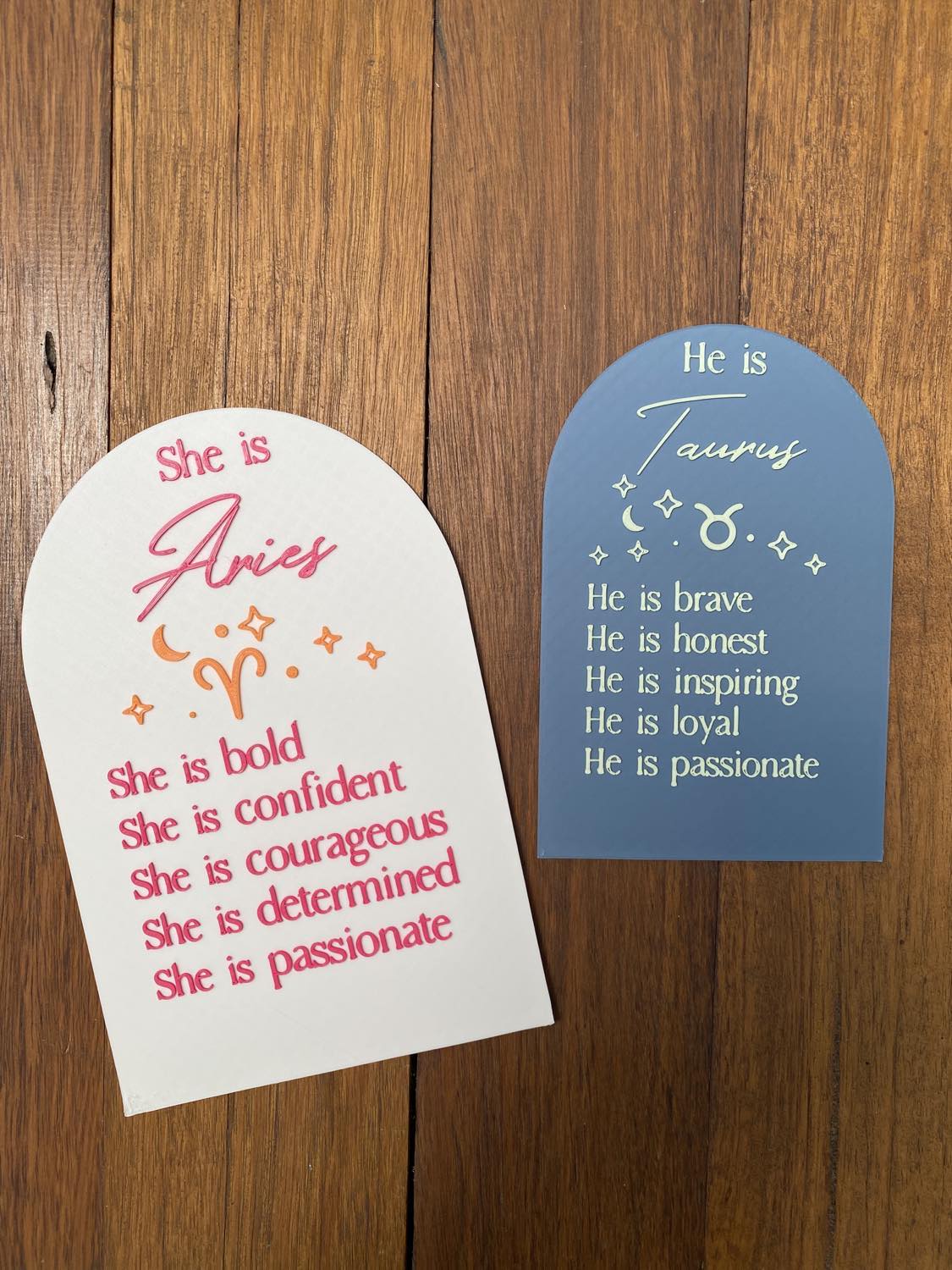 Our ‘He/She Astrology Plaque’ is a Ari & Arlo and COURTTNEYROSE COACHING collaboration. Each plaque has been careful curated, Courtney using her cosmic skills to hand pick astrological affirmations to help make healthy habits for you and your children and us with our design magic. Every Star Sign in our ‘He/She Astrology Plaque’ has a unique design that resembles the constellation for that astrological sign.