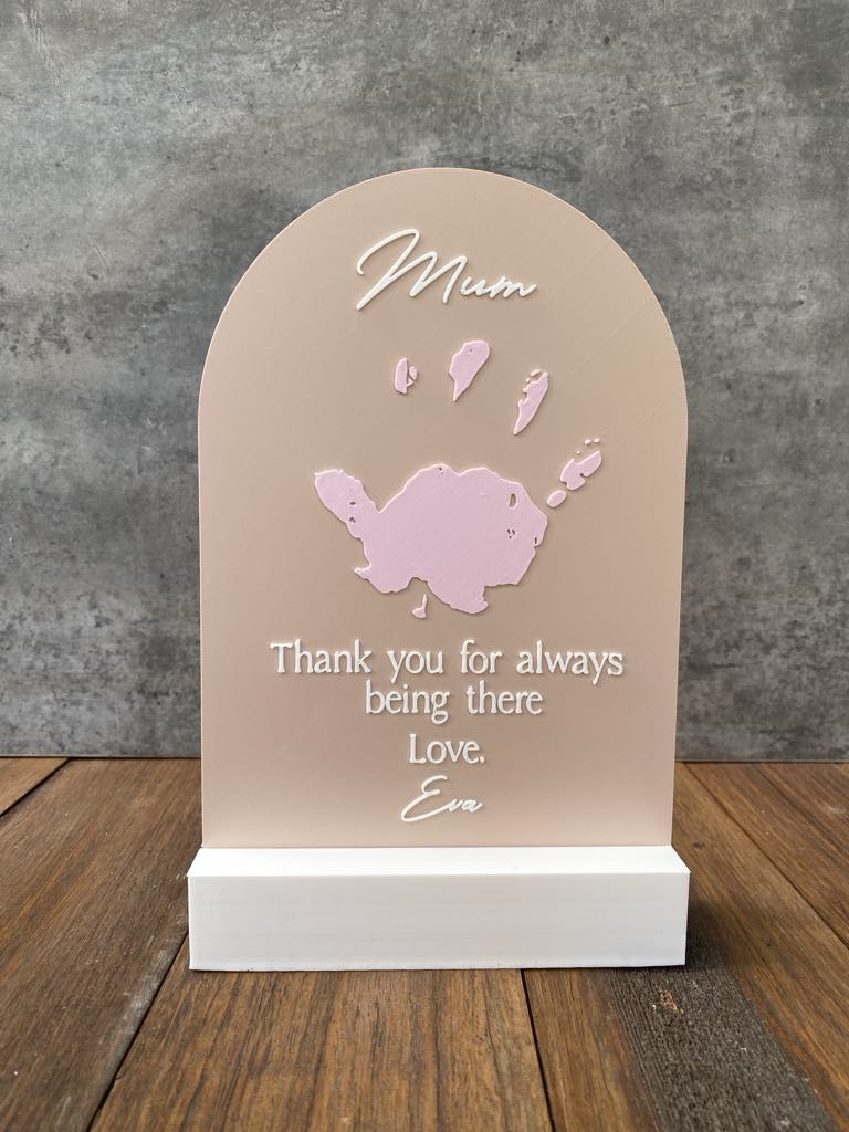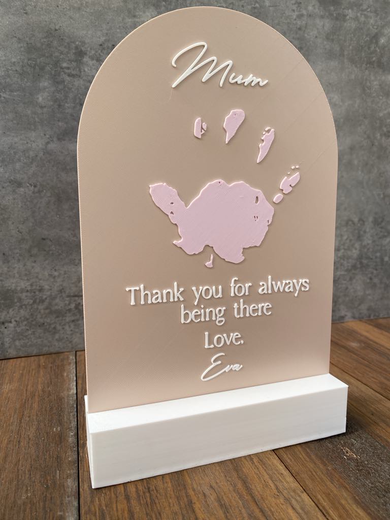 Our ‘Mother’s Day Hand/Footprint’ is the perfect personalised gift this Mother’s Day! A great way to celebrate the mums in our lives. Our Mother’s Day Hand/Footprint allows you to personalise with mum, grandma or whoever you want to gift it to, your little ones hand or foot print and with your child or children’s name. It’s a 3D printed version of your little ones hand/footprint!